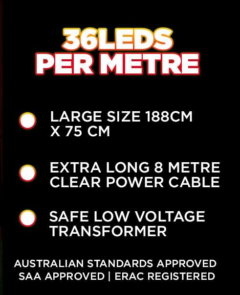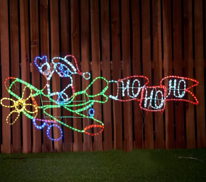 Experience the holidays in style with this beautiful LED Santa Claus riding on his jet plane, a 190cm wide light display that will bring the spirit of Christmas into your neighbourhood and home. Made with 36LEDs per metre, this design glistens with four vibrant colours of blue, white, green and red. This makes a bright cheery accent display to welcome your incoming guests to your home. A wonderful way to cheer up the kids and adults that will pass by your house.